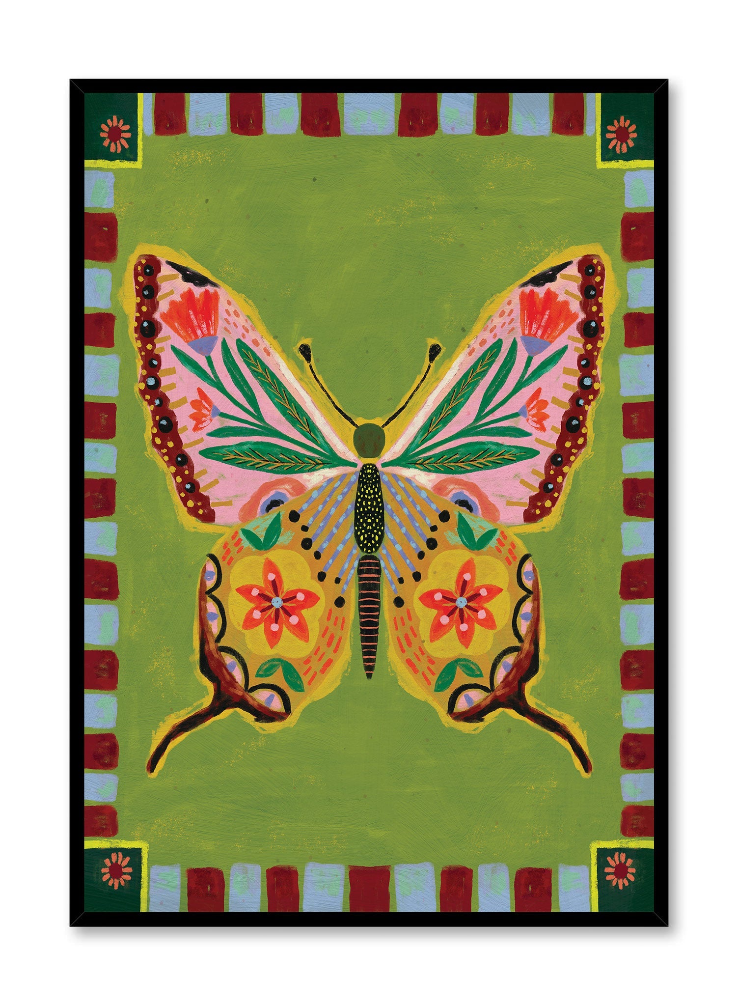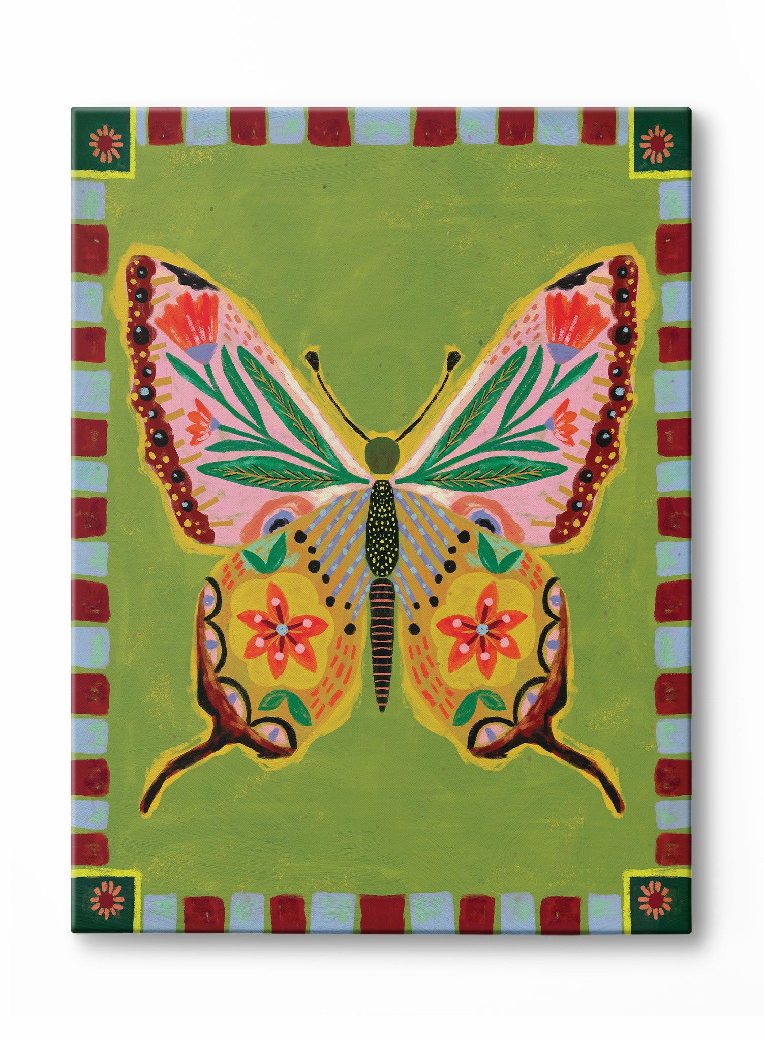 This folk-art butterfly by Kenzie Elston brings garden daydreams into flight. Its bright wings burst with floral details and decorative patterning, set against a mossy green background with a checkerboard border in deep red and powder blue.