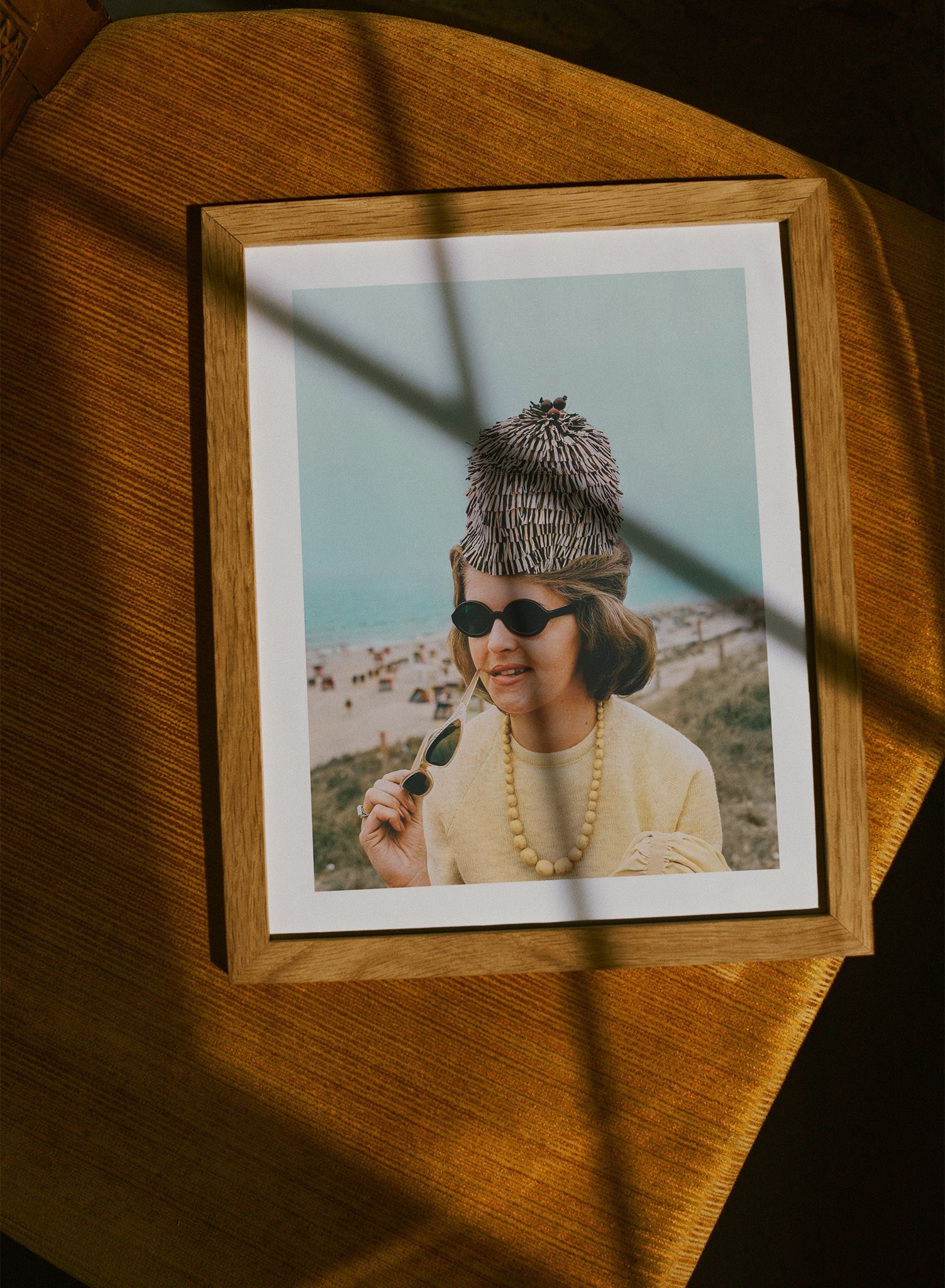 A captivating portrait of quirky elegance, this gallery-quality archival print celebrates a unique and unforgettable sense of style. The woman’s thoughtful expression is framed by her chic accessories: a stunningly original, textured beehive-style hat, a sunny yellow beaded necklace, and a pair of sunglasses held playfully to her lips. Discovered in rare photo archives, this image feels like a treasured frame from a stylish European holiday, capturing a personality that is as bright and memorable as the coastal sun.