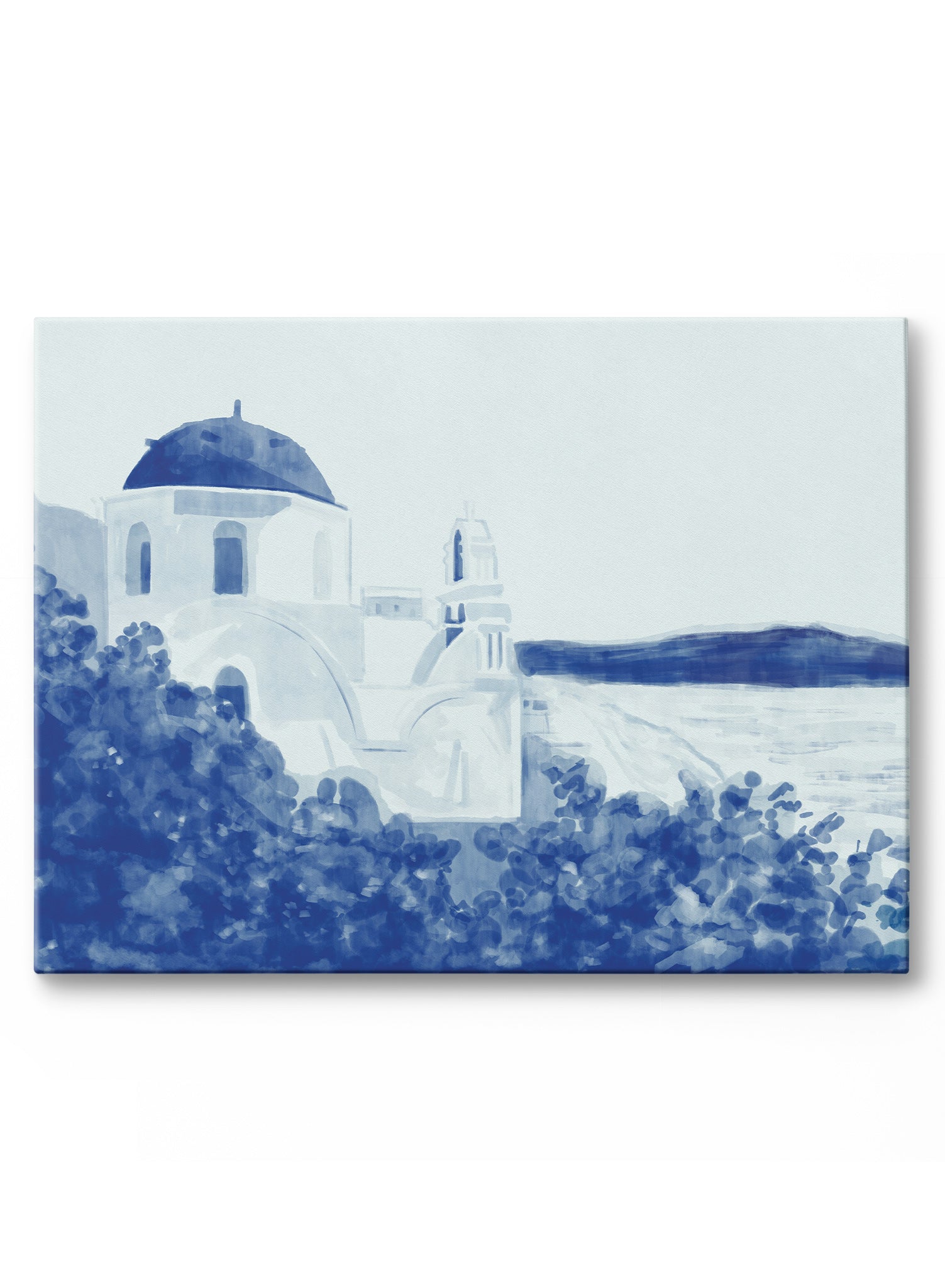 This serene, painterly print captures the iconic beauty of a coastal chapel, its brilliant white walls and striking blue dome set against a calm sea. Rendered in an almost abstract, impressionistic style, the artwork focuses on form and colour to evoke a feeling of peace and tranquility. It’s a modern interpretation of a classic Mediterranean scene, celebrating the simple, breathtaking architecture that has become synonymous with a European seaside escape.