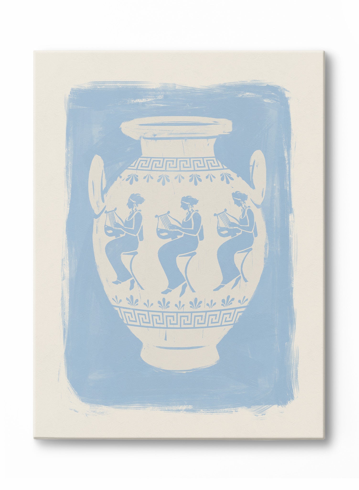 This elegant print depicts a classical Greek amphora, decorated with a scene of graceful figures playing the lyre. The composition pays homage to the art of antiquity, capturing a moment of serene, musical beauty. The iconic Greek key motif borders the top and bottom of the vase, adding to its authentic, classical sensibility. It’s a sophisticated piece that speaks to the history, mythology, and artistry of the Mediterranean.